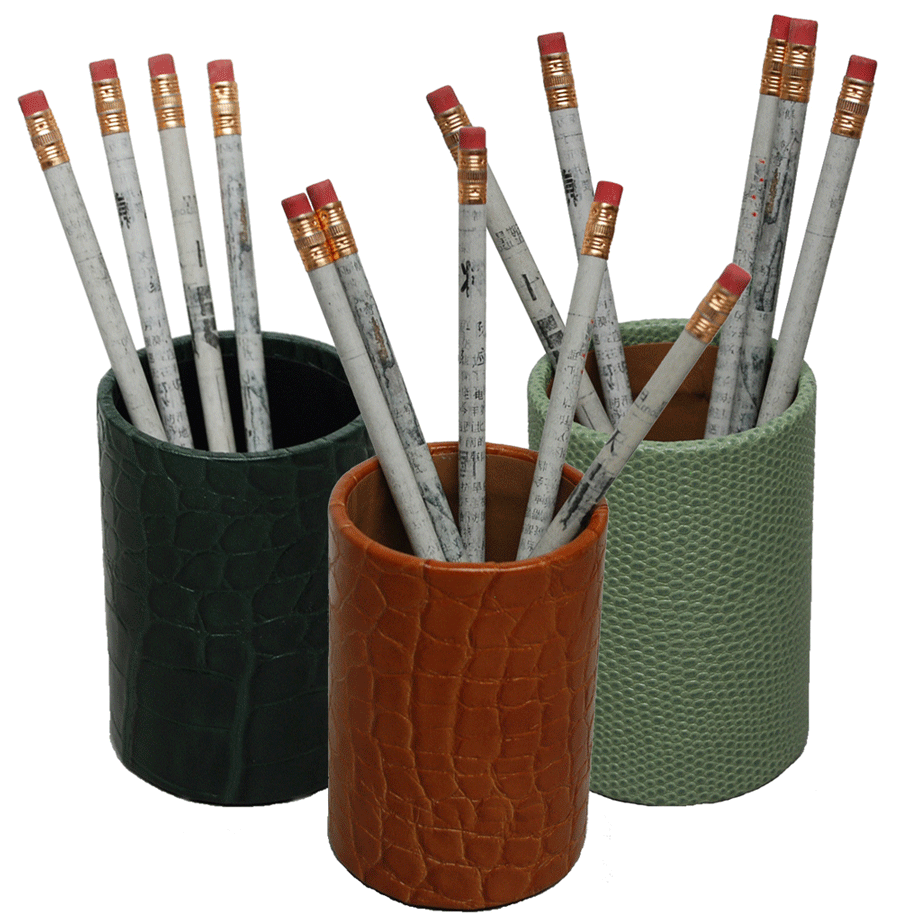 Features: Reptile textured, precision-crafted from the finest genuine leather. Felt bottom protects desk surface. Smooth leatherette inside surface (pencils not included). Comes in additional colors and textures - please call for details on production time for custom colors.